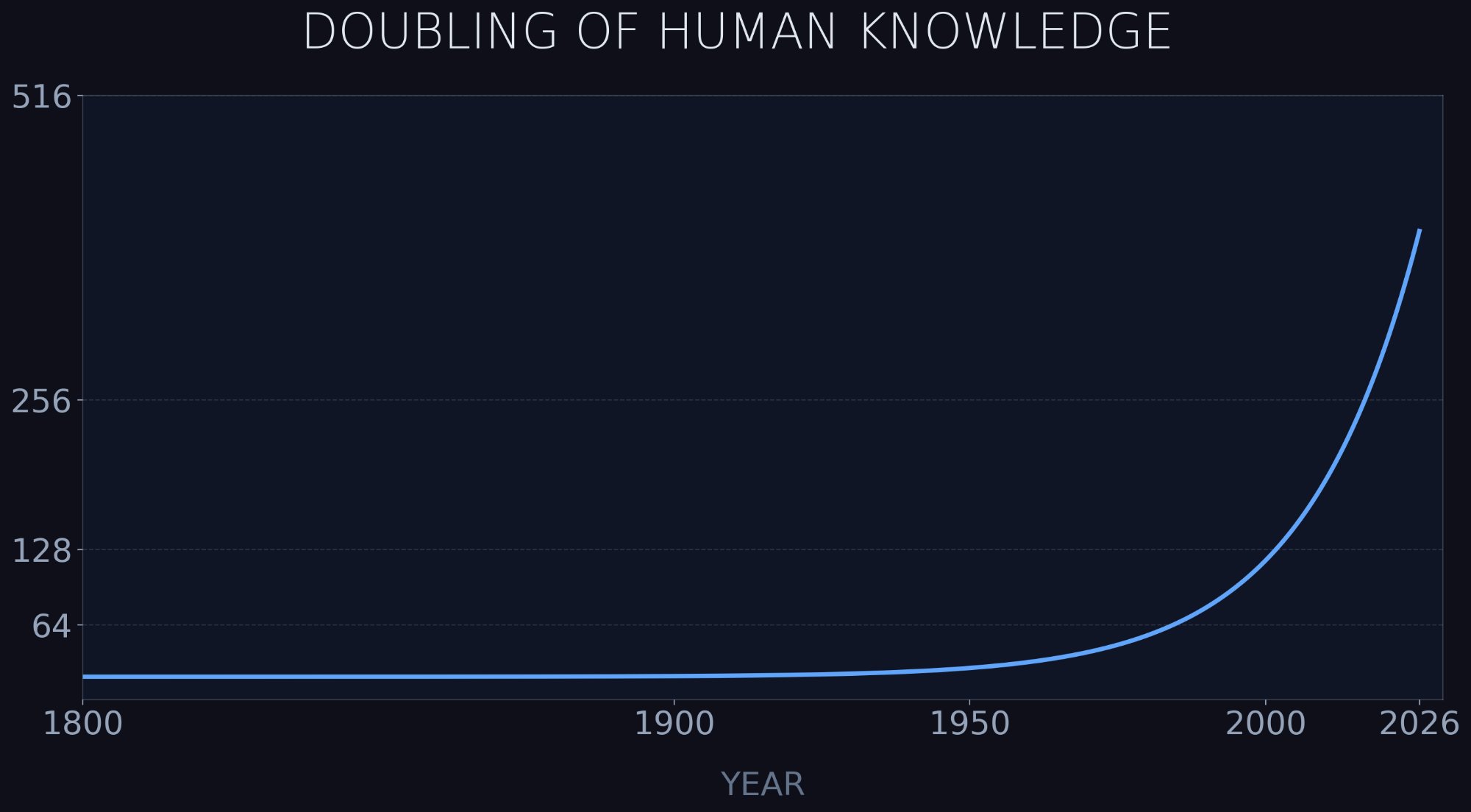 Throughout history, human knowledge doubled every century until 1900. By 1950, human knowledge doubled every 25 years. By 2000, knowledge doubled every 5 years. Today, human knowledge is doubling every 13 months.